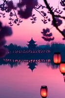 Zachte pastelkleuren dompelen de scène onder in een rustgevende sfeer, terwijl delicate kersenbloesems en glinsterende lantaarns romantische accenten toevoegen. Op de achtergrond wordt een traditioneel gebouw weerspiegeld in het glinsterende water, dat een vredige sfeer uitstraalt. Dit kunstwerk is perfect voor de slaapkamer om een oase van ontspanning te creëren.