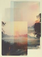 Zachte lagen mist en bomen creëren een etherisch landschap. Overlappende elementen voegen diepte en textuur toe aan de serene scène