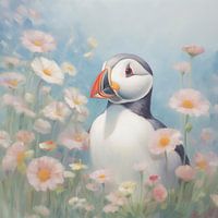 Een papegaaiduiker omringt door bloemen. De pastelkleuren en het lage contrast zorgen voor een serene uitstraling.