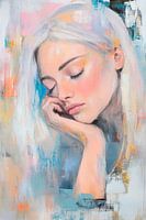 Het beeld van een peinzende jonge vrouw ontvouwt zich in zachte pastelkleuren. Haar gesloten ogen en delicate gezichtsuitdrukking stralen een diep gevoel van kalmte uit. Het contrast tussen haar blonde haar en de levendige kleurvlakken op de achtergrond geven de scène een dromerige lichtheid en vangen een moment van innerlijke contemplatie.