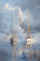 Zeilboten glijden rustig over het water, hun beweging gevangen in een kunstzinnige onscherpte die een gevoel van abstractie en creativiteit oproept. De scène ademt een dromerige sfeer uit, waar lucht en zee in perfecte harmonie samenkomen.