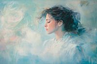 Een zachte zweem van dromen omringt het gezicht van de jonge vrouw, wier gesloten ogen wegzinken in een wereld van innerlijke rust. Haar vloeiende haar raakt de delicate kleuren van de achtergrond, terwijl de stroom van licht en schaduw een bijna etherische sfeer creëert die een moment van contemplatie vastlegt.