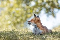 Een rode vos ligt lekker in het gras op een warme zomermiddag. Zijn neus in de lucht maakt van deze foto een dromerig beeld.