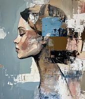 dromerig en introspectief portret van een vrouw, waarbij haar gezicht in profiel wordt weergegeven tegen een abstracte achtergrond. De zachte, verfijnde trekken van het gezicht contrasteren mooi met de ruwe, expressieve penseelstreken die de achtergrond vormen. De kleuren zijn subtiel en aards, met tinten van blauw, beige, bruin en…
