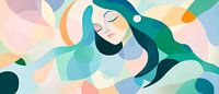 In zachte pastelkleuren ontvouwt zich een dromerige compositie waarin een serene figuur met gesloten ogen zweeft. De harmonieuze kleurtonen en vloeiende lijnen creëren een rustgevende sfeer. Dit kunstwerk is ideaal voor een slaapkamer of meditatieruimte om rust en ontspanning te bevorderen.