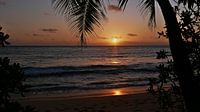 Dromerige zonsondergang onder kokospalmen op het strand Anse Takama op het eiland Mahé in de Seychellen met oranje gekleurde lucht en de zon aan de horizon weerspiegeld in de zee.