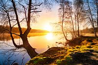 Zonsopgang aan het meer, natuurlijk landschap met bos en water. De foto is genomen in de vroege ochtenduren aan het meer bij Klazienaveen.