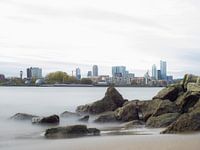 Door gebruik te maken van een lange sluitertijd wordt het water mooi strak en worden de golven die op de keien breken een soort mist. Op de achtergrond zien we de de skyline van Rotterdam. Hier wilde ik de rust en de reuring vastleggen.