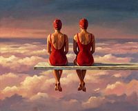 Dit schilderij legt een surrealistisch en contemplatief moment vast, waarin het gewone en het buitengewone samenkomen. Vanuit het perspectief van de kunstenaar is het een meditatie over verwachting, vrijheid en het onbekende. De twee vrouwen, gekleed in identieke rode badpakken en badmutsen, zitten naast elkaar op een verweerde witte…