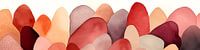 De vormen doen denken aan een rustige, stille dans van bladeren of vlammen, met een dynamische energie die uitgaat van de diepere, verzadigde tinten aan de basis tot de zachtere, lichtere tonen die naar boven toe vervagen. Er is een subtiele textuur aanwezig, met zachte stipjes die lijken op de delicate punten van een fijne pen, wat een extra laag van detail en diepte geeft aan het stuk. De kleuren variëren van warm perzik en roze tot rijke bordeauxrood en dempende grijstinten, waardoor een harmonieus palet ontstaat dat de kijker omarmt met zijn rustige schoonheid.