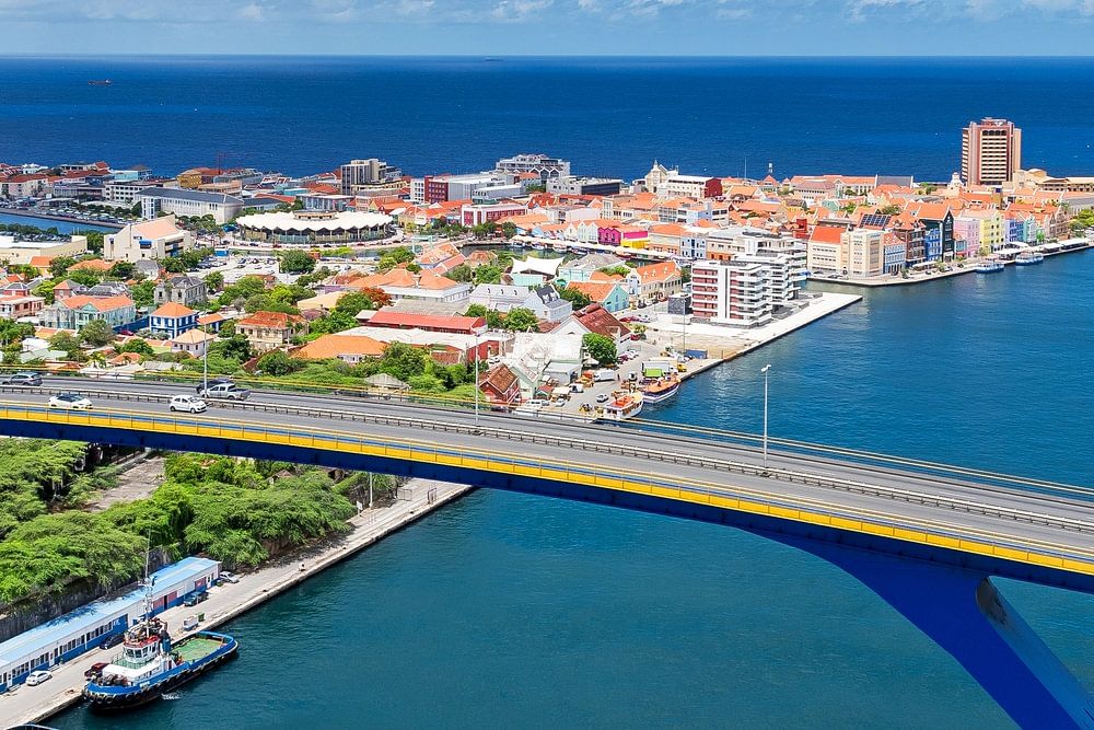 Deze adembenemende drone-opname vangt de iconische Julianabrug op Curaçao in volle glorie, prominent in de voorgrond. De imposante boog, een van de hoogste bruggen in het Caribisch gebied, overspant majestueus de Sint Annabaai en verbindt de historische stadsdelen Punda en Otrobanda. Vanuit de lucht zie je hoe de brug als een stalen ruggengraat de stad bijeenhoudt, terwijl het verkeer er als mieren overheen beweegt. Daarachter ontvouwt zich het kleurrijke hart van Willemstad. Links schittert Punda met zijn beroemde Handelskade: een rij statige, pastelkleurige koloniale panden die weerspiegeld worden in het kabbelende water. Rechts ligt Otrobanda, levendig en authentiek, met een mix van oude en nieuwe architectuur. De zee in de verte en de zon die over de daken glinstert, geven de stad een warme, tropische gloed. Deze opname laat niet alleen een indrukwekkend staaltje infrastructuur zien, maar ook het kloppende hart van Curaçao—waar geschiedenis, cultuur en dagelijks leven samenkomen in één spectaculair beeld dat de ziel van het eiland perfect weerspiegelt.