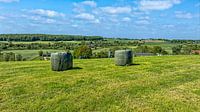 Drone panorama van de Zuid-Limburgse heuvels bij Epen met hooibalen op de voorgrond en vakwerkhuisje op de achtergrond