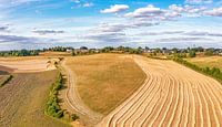 Dronefoto van de Huls bij Simpelveld waar boeren bezig zijn het graan te oogsten op de Zuid-Limburgse heuvels
