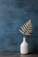 Dit verfijnde ontwerp straalt rust en eenvoud uit. De minimalistische keramische vaas, gecombineerd met een enkele tak met een droog blad, vormt een harmonieus geheel tegen de diepe blauwe achtergrond. Het natuurlijke kleurenschema, met aardetinten en een vleugje goud, voegt een warme, serene sfeer toe. Perfect als wanddecoratie in een…