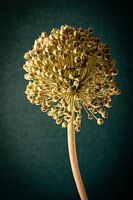 De zachte belichting en diepe schaduwen brengen een gevoel van rust, mysterie en tijdloosheid. De verwelkte en bloeiende bloemen symboliseren de vergankelijkheid van het leven, een moment van schoonheid gevangen in stilte.