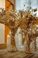 Twee glazen potten met gedroogde veldbloemen op een verweerde houten tafel in warm kaslicht.