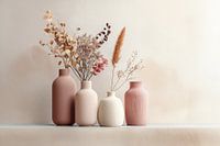 Een kunstzinnige en serene compositie van droogbloemen en pluimen die een kalme, herfstige sfeer uitstralen. De verschillende vazen in aardse tinten laten de natuurlijke schoonheid van de gedroogde planten spreken, waardoor een gevoel van verstilde elegantie ontstaat.