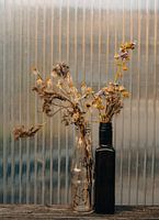Twee eenvoudige flessen—helder glas en donker glas—vangen een luchtig boeket van gedroogde veldbloemen tegen een transparante serrewand. Zachte, warme tinten en minimalistische lijnen geven dit beeld een kalme, poëtische sfeer. Mooie wanddecoratie voor keuken, eetkamer, studio of café—ideaal voor liefhebbers van slow living en botanische esthetiek.