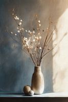 Een serene compositie waarin een elegante beige vaas met fragiele droogbloemen centraal staat, vergezeld door twee decoratieve bollen. Het zachte licht creëert een subtiel schaduwspel op de achtergrond, wat resulteert in een tijdloos stilleven met een moderne twist. De delicate witte bloemen contrasteren prachtig met de dunne bruine stengels, wat zorgt voor een verfijnde balans in het geheel.