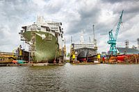 Schepen liggen in droogdok voor reparatie in Hamburg