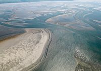 Zandplaten vallen droog bij laagwater in de Waddenzee. De Waddenzee tussen het vaste land en de eilanden staat , ter bescherming van het unieke gebied, op de werelderfgoed lijst en is een natura 2000 gebied.