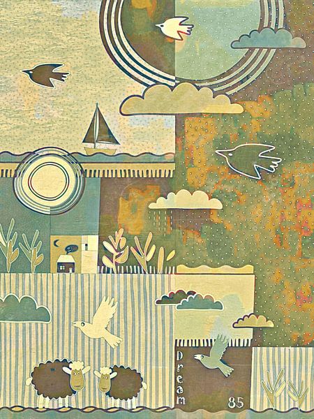 Droom 85 - over reusachtige vogels en nog veel meer, is een abstracte weergave van een bedachte droom. In deze droom staan de vliegende vogels, de plantengroei en de schapen niet in verhouding tot het huis waarin de dromer slaapt, de zeilboot en de wolken.