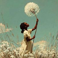 In dit poëtische beeld staat een jong meisje in een veld vol tere witte bloemen, haar blik omhoog gericht naar een reusachtige pluizenbol die ze voorzichtig omhooghoudt. De heldere blauwe lucht vormt een krachtig contrast met haar zachte, lichte jurk en de fragiele structuur van de bloem.