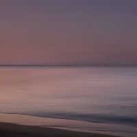 Abstract landschap bij zonsondergang met zee, golven en beweging in rood-paarse tinten, gereduceerd en minimalistisch.