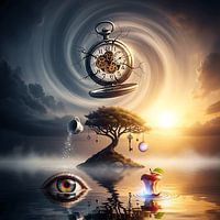 Zwevende vormen, symbolische elementen en abstracte landschappen smelten samen in een droomachtige compositie en creëren een gevoel van mysterie en emotionele diepte.