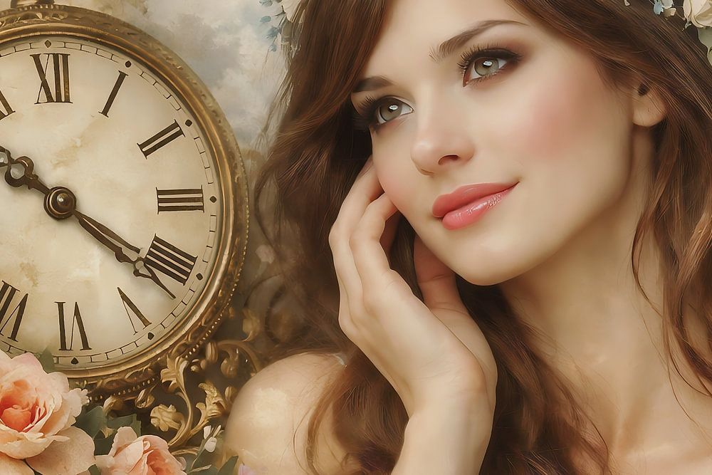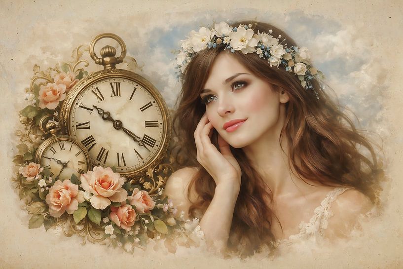In een wereld gedompeld in sepia, waar de lucht ruikt naar oude boeken en vergane rozen, zit een jonge vrouw. Haar ogen kijken dromerig op naar de verstilde hemel. Naast haar tikken goudkleurige zakhorloges, hun Romeinse cijfers stille…