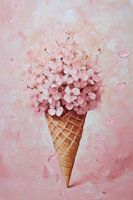 Een verleidelijke symbiose van zoetheid en natuur ontvouwt zich in delicate tinten roze en crème. De wafelhoorn, traditioneel bedoeld voor ijs, draagt in plaats daarvan een weelderige bloemenpracht die de kijker meeneemt naar een bloeiende droomwereld. De tere bloesems lijken te zweven in de lucht, terwijl zachte penseelstreken een sfeer van lichtheid creëren.
