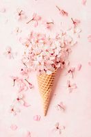 Hier ontvouwt zich een dromerige mix van delicate kersenbloesems en een knapperige wafelhoorn: De bloesems dansen zachtjes in de ruimte, terwijl de wafel een nostalgische zoetheid belichaamt. De zachtroze en crèmekleuren harmoniëren perfect en roepen een romantische lentesfeer op die de kijker meeneemt naar een bloeiende fantasiewereld.