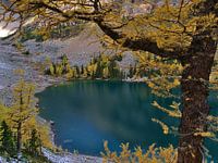 Zicht op het glinsterende blauwgroene Lake Agnes in de Rocky Mountains bij Lake Louise, Alberta, Canada in het Banff National Park in de herfst met op de voorgrond een lariksboom waarvan de naalden geel worden voor het seizoen.