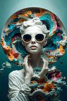 Een prachtige vrouw, met een zonnebril op met wit montuur, omringd door kleurrijke organische vormen, als koraal in de diepte van de zee. Haar bleke porseleinen huid en haar witte haren geven het geheel een dromerige uitstraling, alsof zij een standbeeld is dat tot leven komt. Het beeld is met behulp van ai gegenereerd.