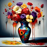 Een stilleven met bloemen in een vaas in de stijl van Jackson Pollock en surrealisme is als een droomachtige explosie van kleur en vorm. De verfspetters en drip techniek die deze kunstvorm kenmerken, nemen een traditioneel tafereel en transformeren het tot iets buitengewoons.