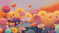 Een surrealistisch fantasieschilderij van bloemenlandschappen, als in een droom. Levendig in warme kleuren zoals oranje, geel, rood, perzik, zachtroze en andere warme lenteachtige pastelkleuren.