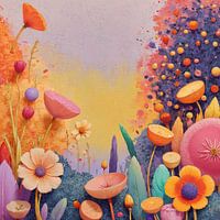 Een surrealistisch fantasieschilderij van een bloementuinlandschap, als in een droom. Levendig in warme kleuren zoals oranje, geel, rood, perzik, zachtroze en andere warme lenteachtige pastelkleuren.