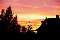 Toen ik een rondje door de wijk fietste tijdens de zonsondergang trof ik deze prachtige lucht aan. Ik reed in een woonwijk en was nog lang niet in het bos, dus zodoende besloot ik om een silhouet van deze situatie te maken. Bomen met een klassiek huis voorzien van een schoorsteen.