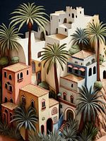Het schilderachtige en exotische tafereel verbeeldt een gestileerde mediterrane of Arabische stad die zich uitstrekt langs een terrasvormige heuvel. De gebouwen zijn versierd in warme tinten wit, beige, roze en blauw, met terracottakleurige daken en kleurrijke accenten. Weelderig groene palmbomen en andere tropische planten groeien tussen de huizen. De donkere achtergrond benadrukt de lichte gebouwen en het levendige groen. De compositie lijkt dicht en rijk aan details, met een zonnige en vredige sfeer.