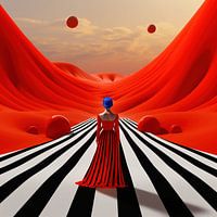 Een surrealistische afbeelding van een vrouw in een rode jurk die op een zwart-wit gestreept pad staat in een woestijnlandschap met rode zandduinen en zwevende rode bollen.