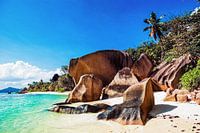 Een lang strand met vele kleine baaien in het eilandenparadijs van de Seychellen, in het midden van de Indische Oceaan. Blauwe hemel, kristalhelder turkoois water, geel strand met fijn zand, kleine en grote exotisch gevormde rotsen met weelderige groene tropische vegetatie. Dit is het droomstrand Anse Source d'Argent op het eiland La Digue. Dit werk werd gemaakt met behulp van verschillende gemengde technieken en digitale schildertechnieken op basis van een foto die door de kunstenaar werd genomen.