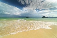 Op het strand van het paradijselijke eiland Koh Ngai in de Andamanse Zee, in de provincie Satun, Zuid-Thailand, ontvouwt zich een tafereel vol mystieke intensiteit. De lucht is bedekt met dikke, grijze regenwolken die laag over de zee hangen en de wereld baden in een somber, bijna magisch licht. De lucht is zwaar, de atmosfeer geladen, alsof de natuur zelf haar adem inhoudt.