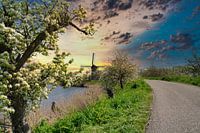 Op de mooi voorjaarsdag fietste ik over de dijk richting de molen. De lente bloesem sierde de bomen. De dijk was nog rustig genieten van de zon die onder ging.