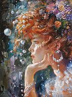 Droomvrouw - Dit vrouwen schilderij toont een dromerige, jonge vrouw met een krullend, rood haar dat versierd is met kleurrijke bloemen en glinsterende bubbels, geportretteerd in een expressieve, bijna impressionistische verfstijl met levendige, dynamische kleuren.