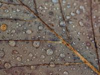 Macro opname van een herfstblad. de wat vettige onderzijde van het blad houdt de regendruppels vast zodat deze als kleine kristallen balletjes op het blad blijven liggen. Door zo dicht bij te komen lijken de nerven net een stratenplan van een grote stad.