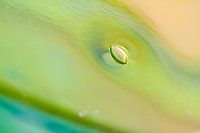 Een buitenaardse sfeer en kleur en een druppel die lijkt te rusten voordat hij valt. Zeegroen en zanderig, vloeiend en metaalachtig. Een natuurplaat-met-een-twist aan je wand.