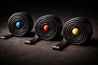 Drie strak opgerolde dropveters staan rechtop opgesteld als atleten aan de start van een race. Van achteren gezien, met hun kleurrijke toverballetjes zichtbaar en een klein stukje drop dat als een sleep achter hen ligt, hangt de spanning voelbaar in de lucht.