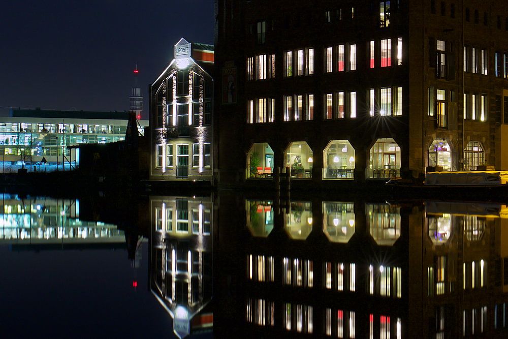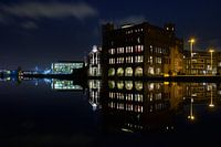 De oude Droste chocoladefabriek, nu een wooncomplex, gereflecteerd in het Spaarne op een rustige winternacht in Haarlem.
