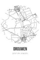 Zwart-witte landkaart, stratenplan of plattegrond van Drouwen. Drouwen is gelegen in de gemeente Borger-Odoorn, provincie Drenthe. Op de stadskaart zijn alle openbare wegen in Drouwen opgenomen. Verder is de kaart voorzien van de coördinaten van het centrum van Drouwen.