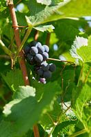 Druiven van het rode druivenras Domina, een kruising tussen de variëteiten Blauer Portugiser en Spätburgunder, verbouwd in 1927 in een wijngaard op de Marienberg boven de stad Würzburg in Duitsland.